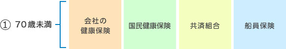 まず、医療保険制度は、75歳を境に大きく2つの制度に分かれます。我が国は国民皆保険制度ですから、国内に住所がある人は全員、いずれかの医療保険に加入することになっており、75歳までは、従事する仕事や事業所によって加入する医療保険が違います。会社員など雇用される人とその被扶養者は会社の健康保険や船員保険、公務員等とその被扶養者は共済組合、農業、漁業等従事者、自営業者等は国民健康保険(ここでのご説明では、国保組合の場合も含めることとします)です。どの医療保険も医療機関に支払う自己負担金は原則、3割です。