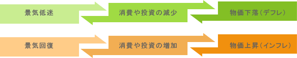 それに対し、インフレで物価の上昇が続くと、「早く買わないと値上がりしてしまう」ので、購入を急ぐことになります。このため、インフレには景気を良くする作用があります。本来は景気が良くなることで物価は上昇するのですが、物価の上昇が起きることで、景気を良くする効果もあります。今、政府や日本銀行が行っている政策も、インフレによって景気が良くなることを期待しています。