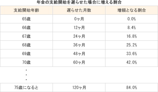 国民年金や厚生年金に加入していた人が老後に受け取る老齢基礎年金は、原則として65歳から支給されます。ただ、本人の希望によって、早めにもらい始めることも、もらい始める年齢を遅らせることもできます。早めにもらう場合は、60歳から選択することが可能です。ただし、本来もらうはずだった額に比べて、1ヶ月早めることにより0.5%減額されます。逆に支給開始を遅らせるときには、1ヶ月につき0.7%増額となります。最大で70歳になるまで延ばすことができます。