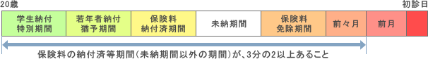 (その障害の原因となった傷病の)初診日の前日において、初診日の属する月の前々月までに、保険料の納付済期間等が、被保険者期間の3分の2以上あること 図のように、免除期間や学生納付特例期間、若年者納付猶予期間も納付済期間とみなされます。