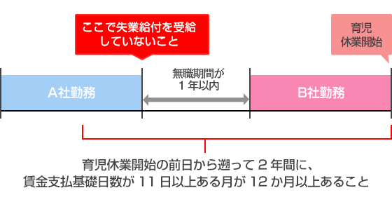 ② 育児休業を開始した日の前2年間に、賃金をもらって働いた日(賃金支払基礎日数)が11日以上ある月が通算して12か月以上あること。