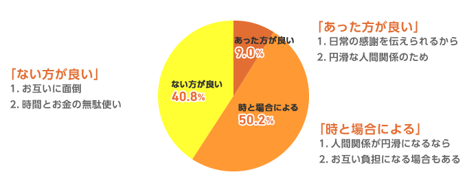 今回のアンケートで分かった事は行事や習慣そのものより、それが「義理や義務」など強制的に感じてしまう事が敬遠されています。自発的に参加したいという、雰囲気を作ることが大切だと言うことがわかりました。