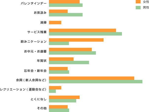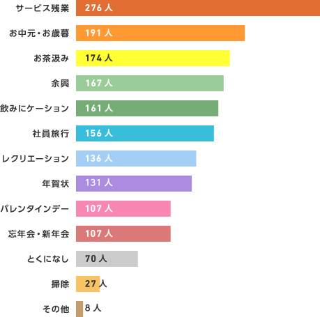 —ここにはバレンタインが「なくなってほしい」人とそうでない人に集まってもらいましたが、その他に日本の習慣に関してなくなってほしいと思うものは?一般女性の回答はダントツで「サービス残業」、次いで「お中元・お歳暮」「お茶くみ」「余興」の順です(Q8)。社内アンケートとは少し差が出ました。