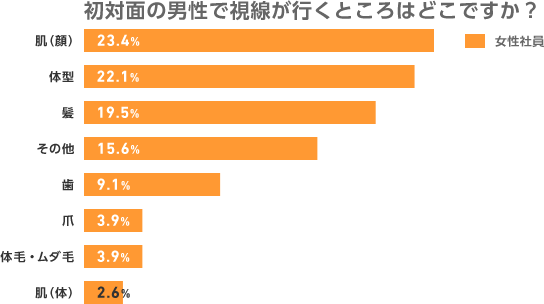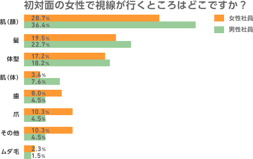 —社員を対象にしたアンケートでは、季節柄、初対面の相手のどこに視線が行くかというのを男女別にとりました。男性に比べて女性は、初対面の相手のいろんなところに目が行っているようです。