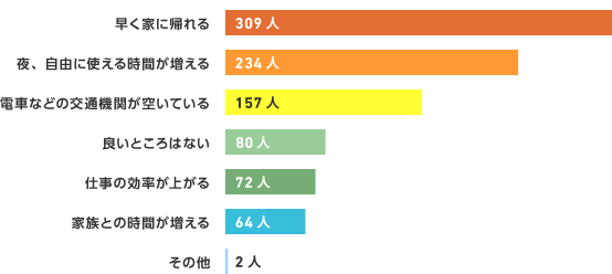 朝型勤務の良い点(もしくは良いと思われる点)を聞いたところ、1位は「早く家に帰れる」(309名)、2位は「夜、自由に使える時間が増える」(234人)との結果になりました。