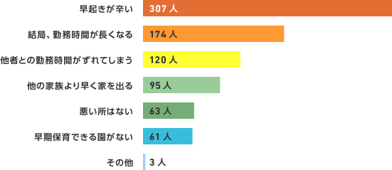 朝型勤務の悪い点(もしくは悪いと思われる点)を聞いたところ、1位は「早起きが辛い」(307名)、2位は「結局、勤務時間が長くなる」(174人)との結果になりました。