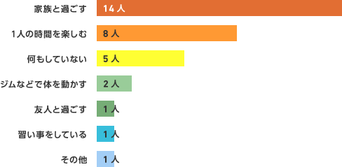 1番多かったのが「家族と過ごす」51.8%(14名)でした。ジムなどで体を動かしたり、習い事をしたりしている人は少なく、ゆう活では『ゆっくり過ごす』方が多いようです。
