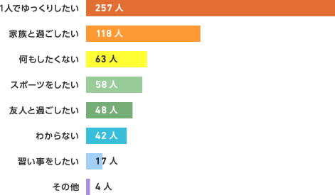 一番多かったのが「1人でゆっくりしたい」54.3%(257名)となりました。