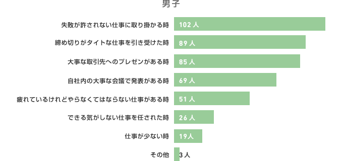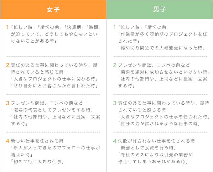 女子の上位に「疲れているけどやらなくてはならない仕事がある時」がランクインしていますが、男子の上位は「大事な取引先へのプレゼンがある時」となっています。