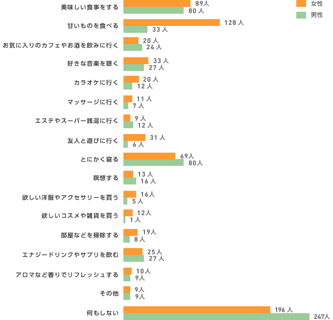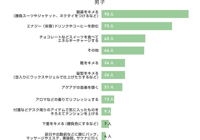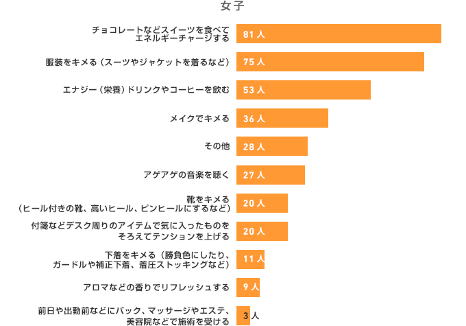女子の1位は「甘いものを食べる」、2位は「服装をキメる」、3位は「エナジードリンクやコーヒーを飲む」でした。