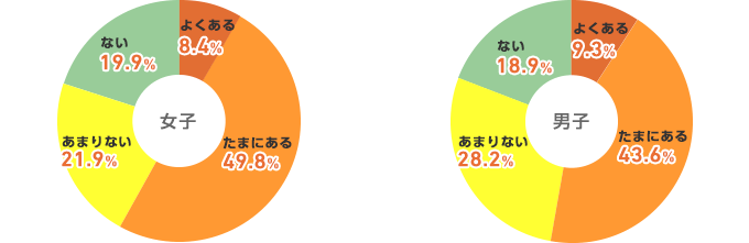 20歳~49歳までの男女1,000名にアンケートしたところ女子の50.2%(251人)、男子の56%(280人)が「ある」と回答しました。