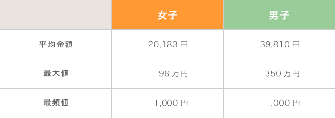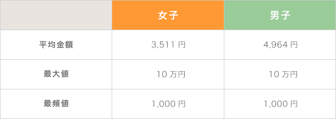 1回に使う金額の平均は男子4,964円、女子3,511円。もっとも多かった回答は男女とも1,000円でした。